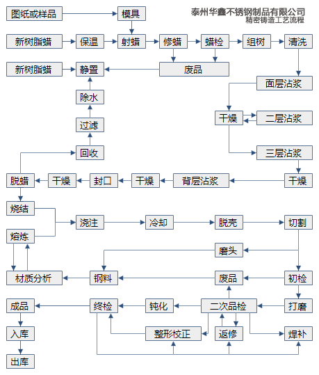 泰州華鑫不銹鋼制品有限公司自1998年從事精密鑄造以來,從表面質(zhì)量、熱處理、機械性能、產(chǎn)品精度等方面克服了大量的技術(shù)難題,這使得我們的鑄件產(chǎn)品質(zhì)量一直處于領(lǐng)先水平。目前我們具有全硅溶膠不銹鋼精密鑄造加工能力500噸/年,單件產(chǎn)品重量范圍從5克至30公斤,并可提供多樣化的表面處理方案。我們生產(chǎn)的材質(zhì)一般為304不銹鋼、316不銹鋼,也可根據(jù)客戶的需求生產(chǎn)各種其他材料如碳鋼、2205雙相鋼、17-4高強度鋼、2520耐高溫鋼等。具體鋼種及用途請訪問以下鏈接:關(guān)于鑄造材質(zhì)。